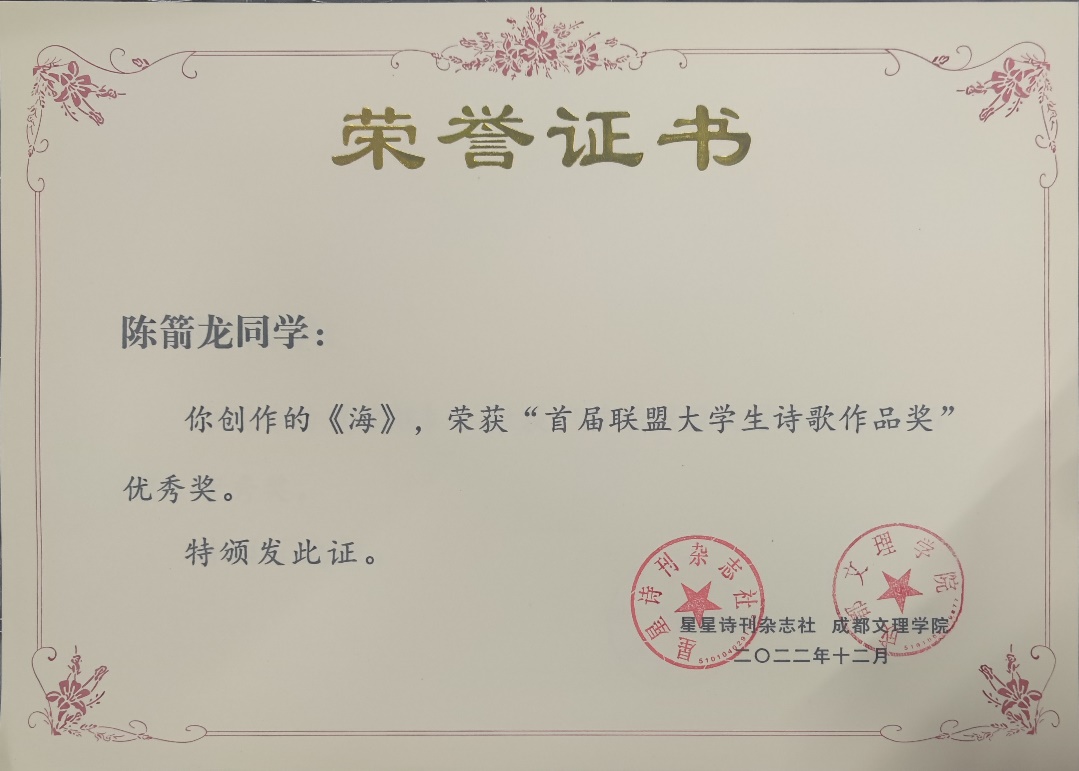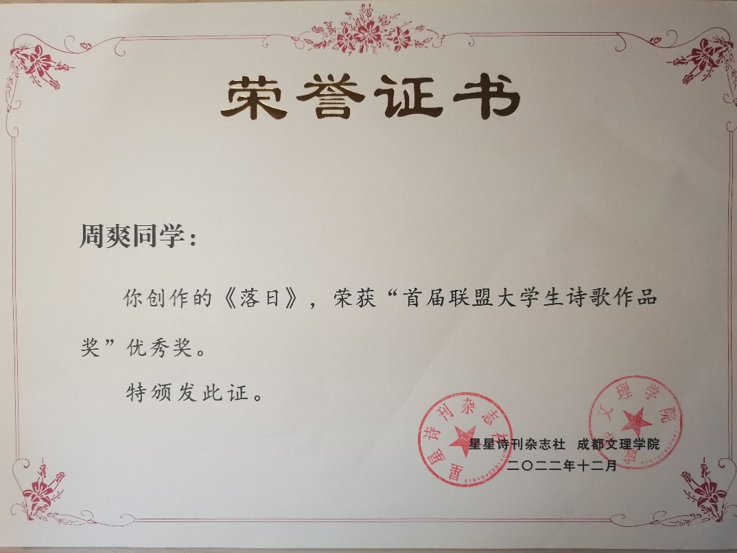在2022年度集团高校首届大学生诗歌比赛中,我院2020级汉语言文学专业的周爽、陈箭龙同学荣获“首届联盟大学生诗歌作品奖”优秀奖。